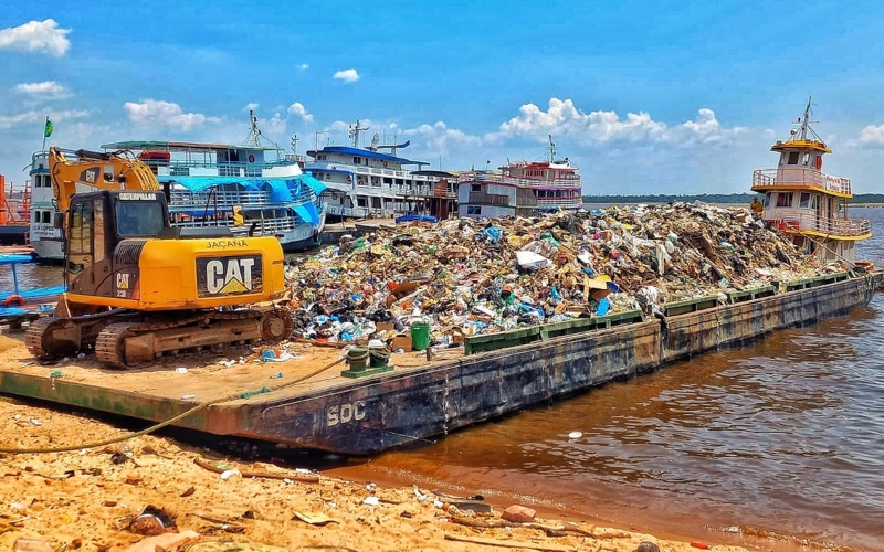 Balsa carregada de resíduos retirados dos igarapés de Manaus. O que flutua aqui é a prova visível de um problema que começa em terra e termina no rio. Foto: Adilson Moura