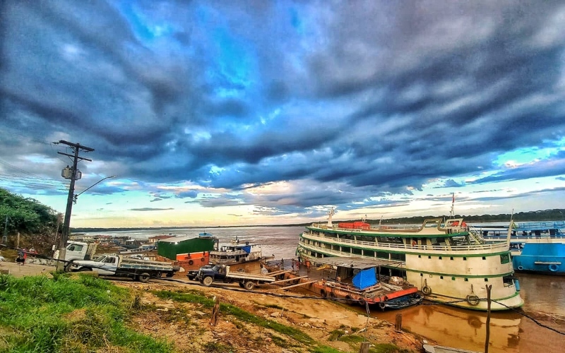 Porto de Manicoré, Amazonas. Em terra, a rotina de quem depende do rio; no céu, as bandas de nuvens dos rios voadores seguem seu curso silencioso, lembrando que a floresta bombeia a umidade que move a vida. Foto: Adilson Moura