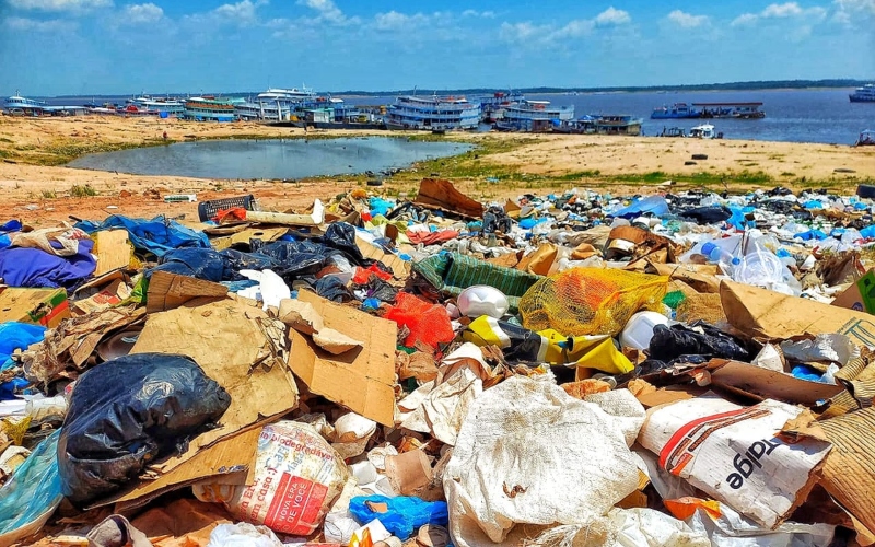 A poucos passos do Rio Negro, um monte de lixo cresce à beira do porto e põe em risco usuários, aves e peixes, transformando a orla em fonte de poluição e microplásticos. Foto: Adilson Moura